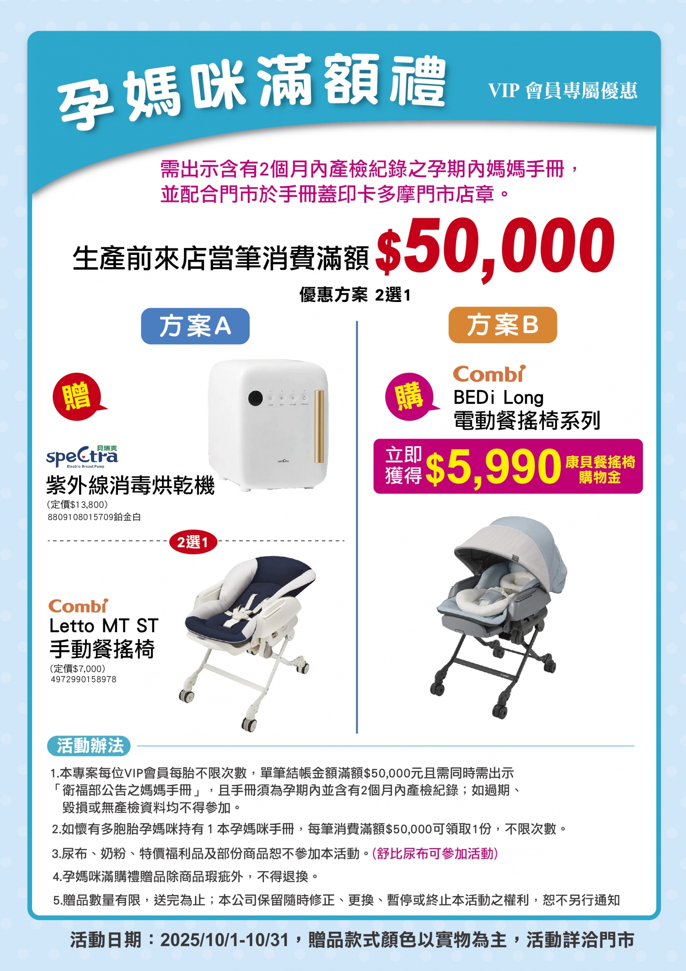 活動辦法:生產前憑孕期內媽媽手冊,來店當筆消費滿50,000元 A/B方案 2選1