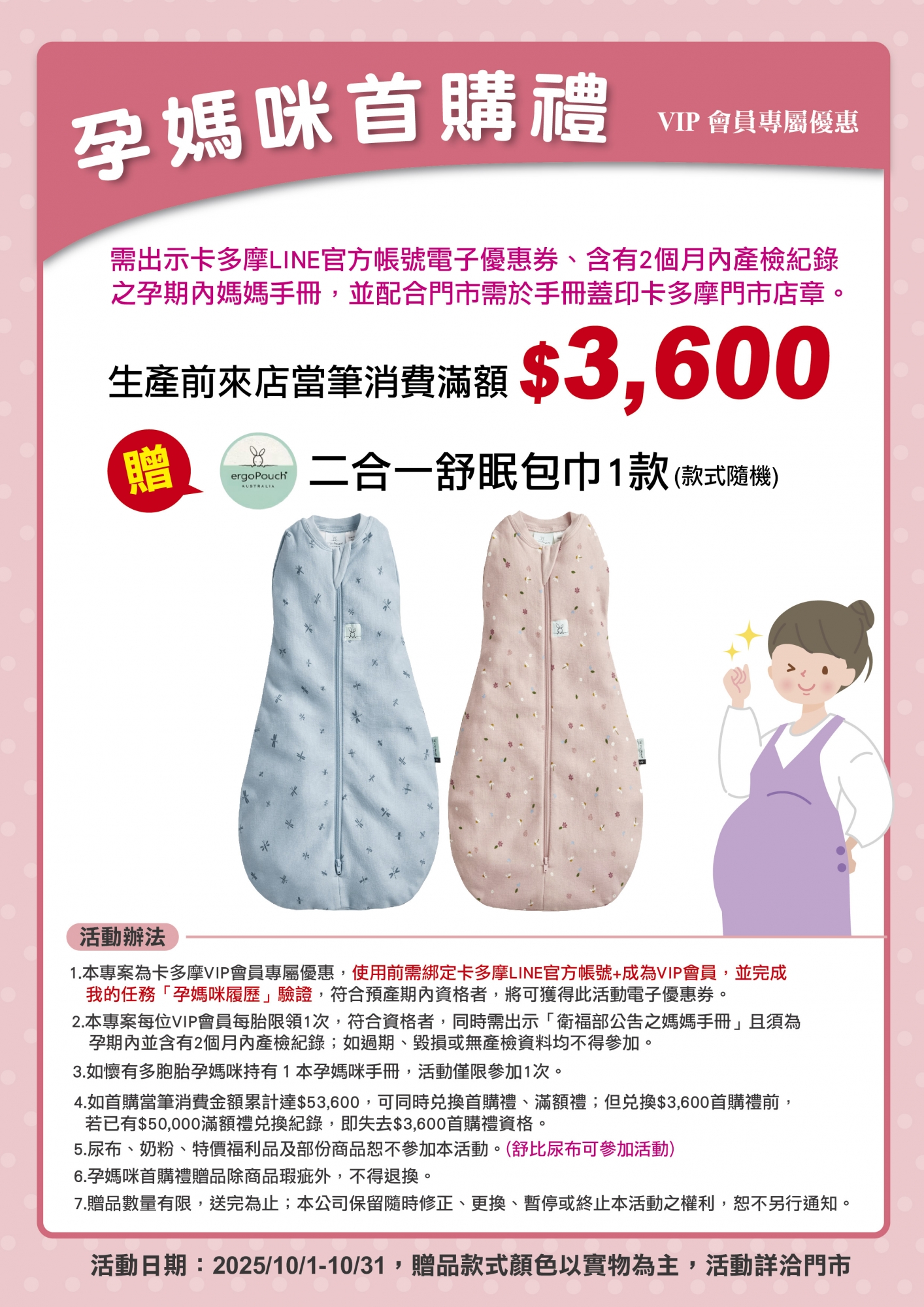 活動辦法:VIP會員憑LINE官方帳號電子優惠券+本人孕期內媽媽手冊,第一次來店當筆消費滿3,600元,贈「ergoPouch 二合一舒眠包巾1款」。