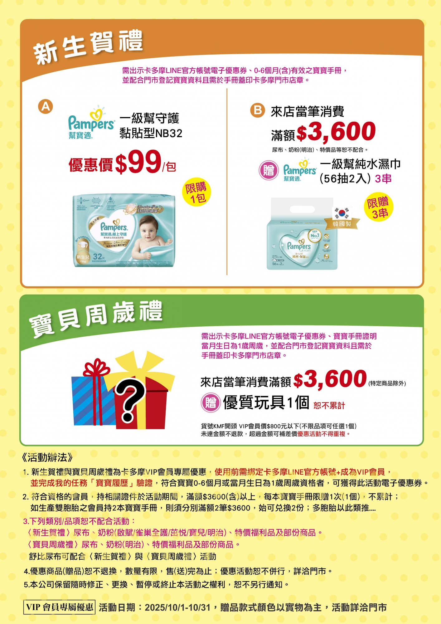 VIP會員憑LINE官方帳號電子優惠券+0-6個月(含)寶寶手冊,即可享有: