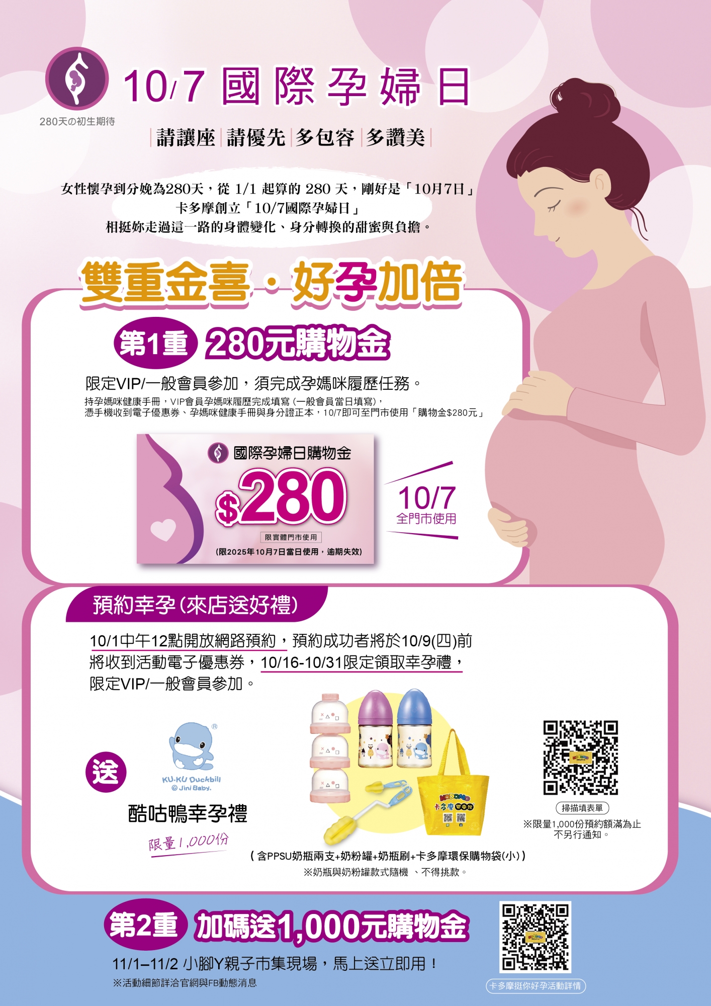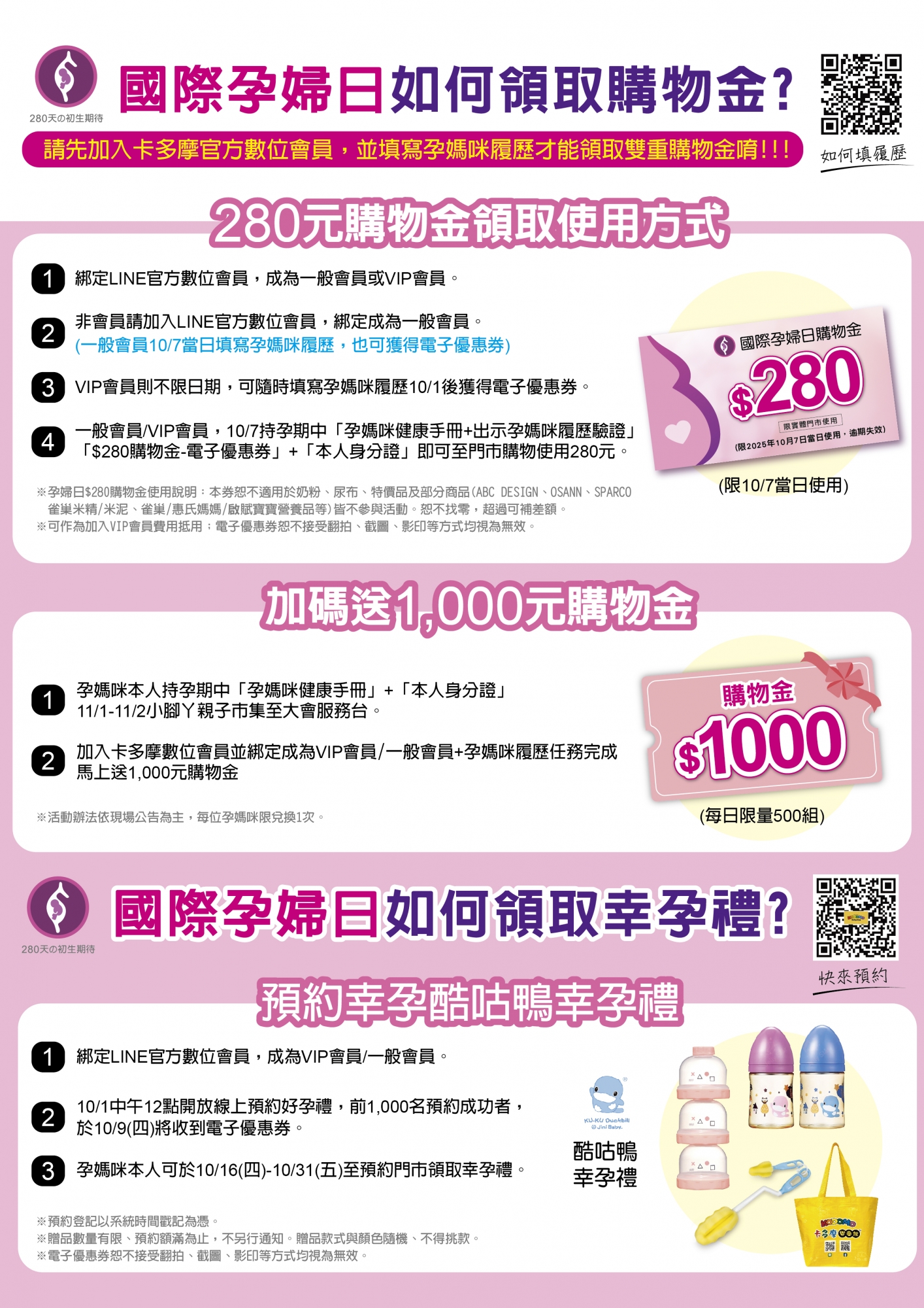 孕媽咪本人持孕期中媽媽手冊+身分證正本+出示手機LINE會員電子優惠券,2025/10/7(一)當日即可至卡多摩全門市使用「購物金$280元」!