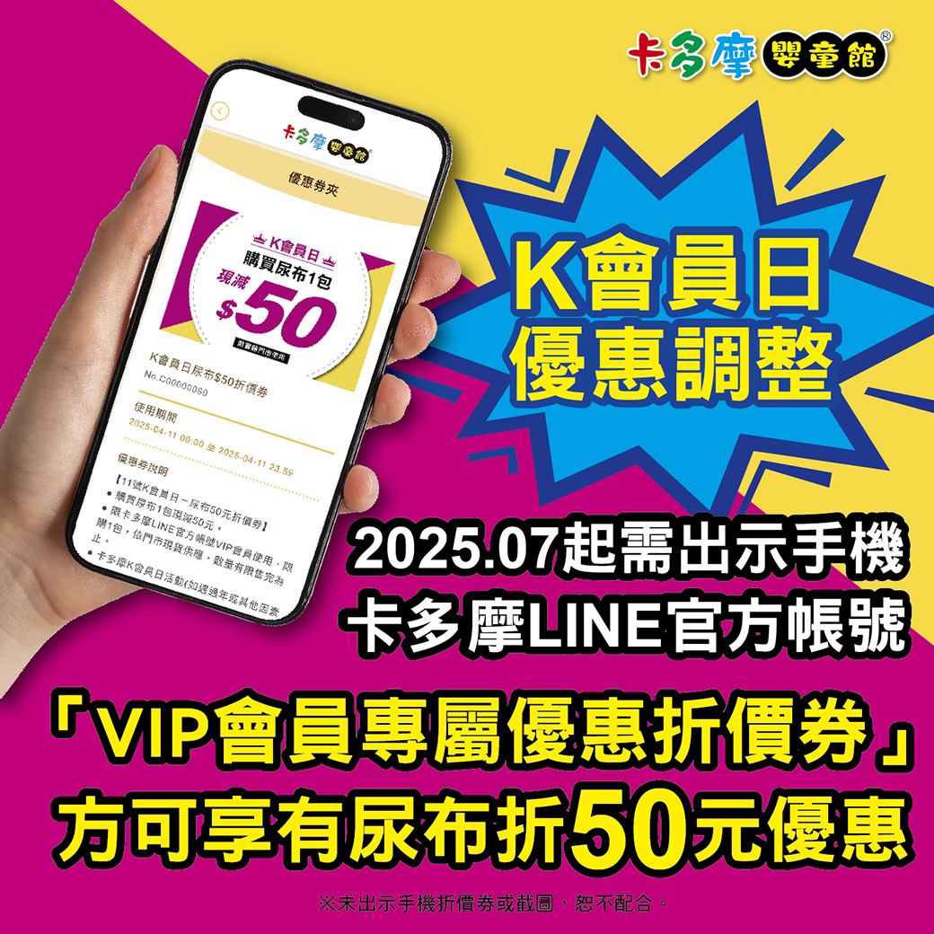 ※ 每月11日則需攜帶VIP會員手機,開啟券夾,出示『K會員日尿布$50折價券』才可使用。